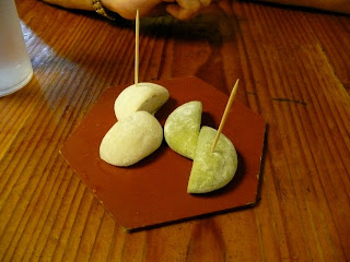 A última foto se refere a uma sobremesa nem tão conhecida (pelo menos nunca encontrei em nenhum restaurante japonês em São Paulo): mochi recheado com sorvete! O mochi da esquerda é recheado com sorvete de feijão doce e o da esquerda com sorvete de chá verde. Uma delícia!