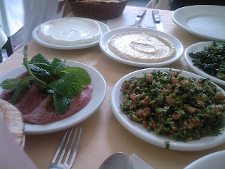 No primeiro andar de um prédio comercial em plena rua 25 de Março...é lá que fica um dos mais tradicionais restaurantes de comida árabe da cidade.O cardápio é bastante extenso (tem até feijoada às quartas!) e, caso você fique na dúvida sobre o que pedir ou estiver com vontade de provar um pouco de tudo...não perca tempo e peça logo o rodízio de pratos árabes! A primeira foto mostra uma parte do rodízio...generosas porções de babaganuche, coalhada seca, homus, cestas de pão sírio e torrada síria, kibe cru, mini esfihas abertas de carne, kafta, charutinho de uva e de repolho, salada tabule...tudo isso trazido à mesa (pequena para tantos pratos!).