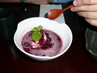 A sobremesa também foi um capítulo à parte...assim como os sobas, além das opções fixas do cardápio, sempre há algumas sugestões especiais do dia. Optamos por uma sobremesa diferente - pêra cozida ao vinho com sorvete de iogurte e mini pedaços de gelatina de alga. Extremamente refrescante e leve!