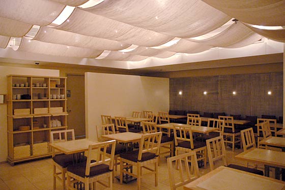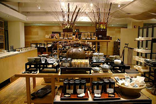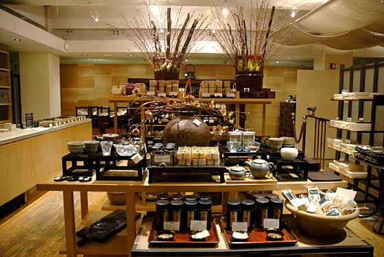Quanto à gastronomia...li num guia de NY que a Takashimaya escondia um oasis em meio à agitação da Quinta Avenida, bem no subsolo do edifício: o restaurante Tea Box. Na verdade, o restaurante é apenas uma parte do que reserva o andar. Ao sair do elevador, encontra-se a loja de chás a granel e diversos acessórios relacionados: chaleiras, xícaras, biscoitos delicados...tudo para acompanhar a bebida. Bem escondido, ao lado direito da loja, está o Tea Box Restaurant. O lugar tem poucas mesas e decoração clean, bem discreta.